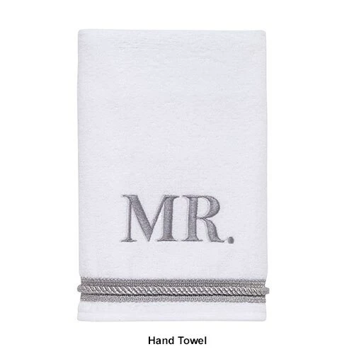 The Avanti Linens Mr. Towel towel collection showcases โMr.โ embroidered in silver block letters with a silver rope trim. This set makes a great bridal or wedding gift. 100% Cotton exclusive of embellishment. Machine wash warm, gentle cycle, tumble dry low. Dry cleaning recommended.Limited Manufacturer’s Warranty.