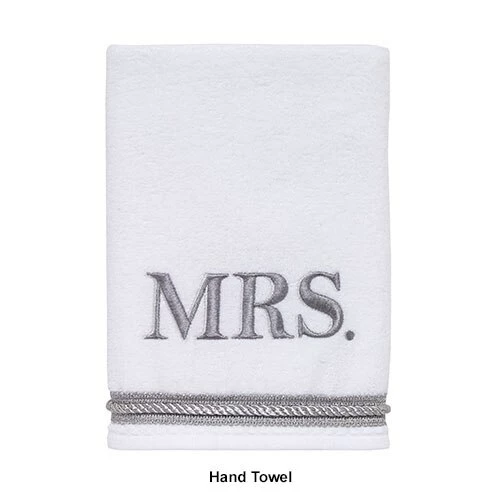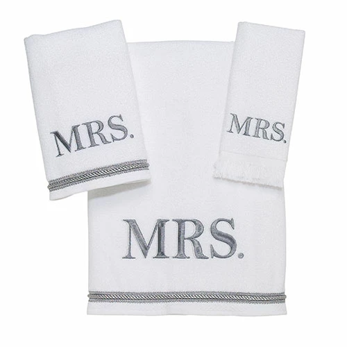 The Avanti Linens Mr. Towel towel collection showcases โMrs.โ embroidered in silver block letters with a silver rope trim. This set makes a great bridal or wedding gift. 100% Cotton exclusive of embellishment. Machine wash warm, gentle cycle, tumble dry low. Dry cleaning recommended.Limited Manufacturer’s Warranty.