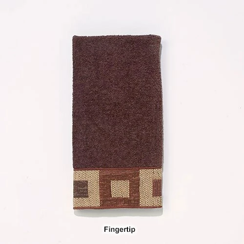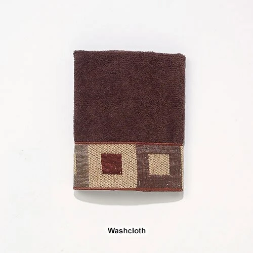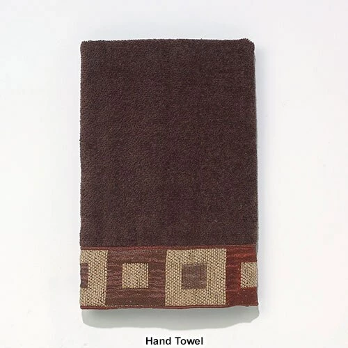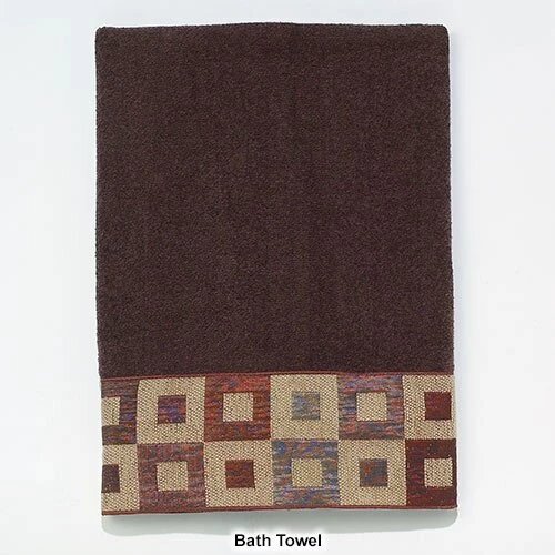 The Avanti Linens Precision towel collection showcases a sleek mocha colored towel with a contemporary geometric and jacquard border in shades of brown, taupe, and gold. This set adds a beautiful finishing touch to any dΓ©cor in your restroom. 100% Cotton exclusive of embellishment. Machine wash warm, gentle cycle, tumble dry low. Dry cleaning recommended.Limited Manufacturer’s Warranty.