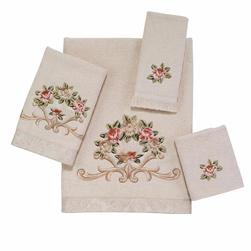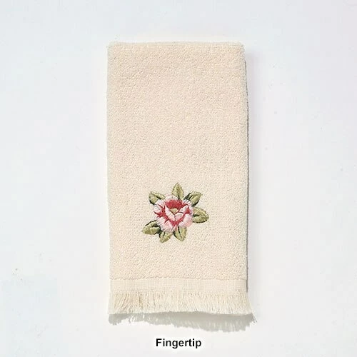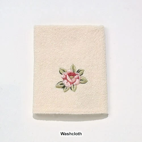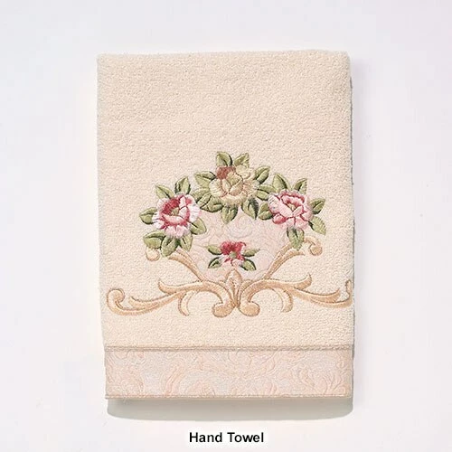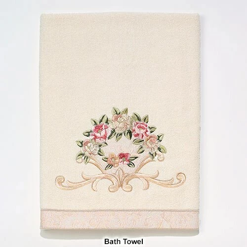 The Avanti Linens Rosefan towel collection showcases a beautiful floral embroidered bouquet in soft pastel colors. The tonal damask fabric border adds an elegant touch to any dΓ©cor in your restroom. 100% Cotton exclusive of embellishment. Machine wash warm, gentle cycle, tumble dry low. Dry cleaning recommended.