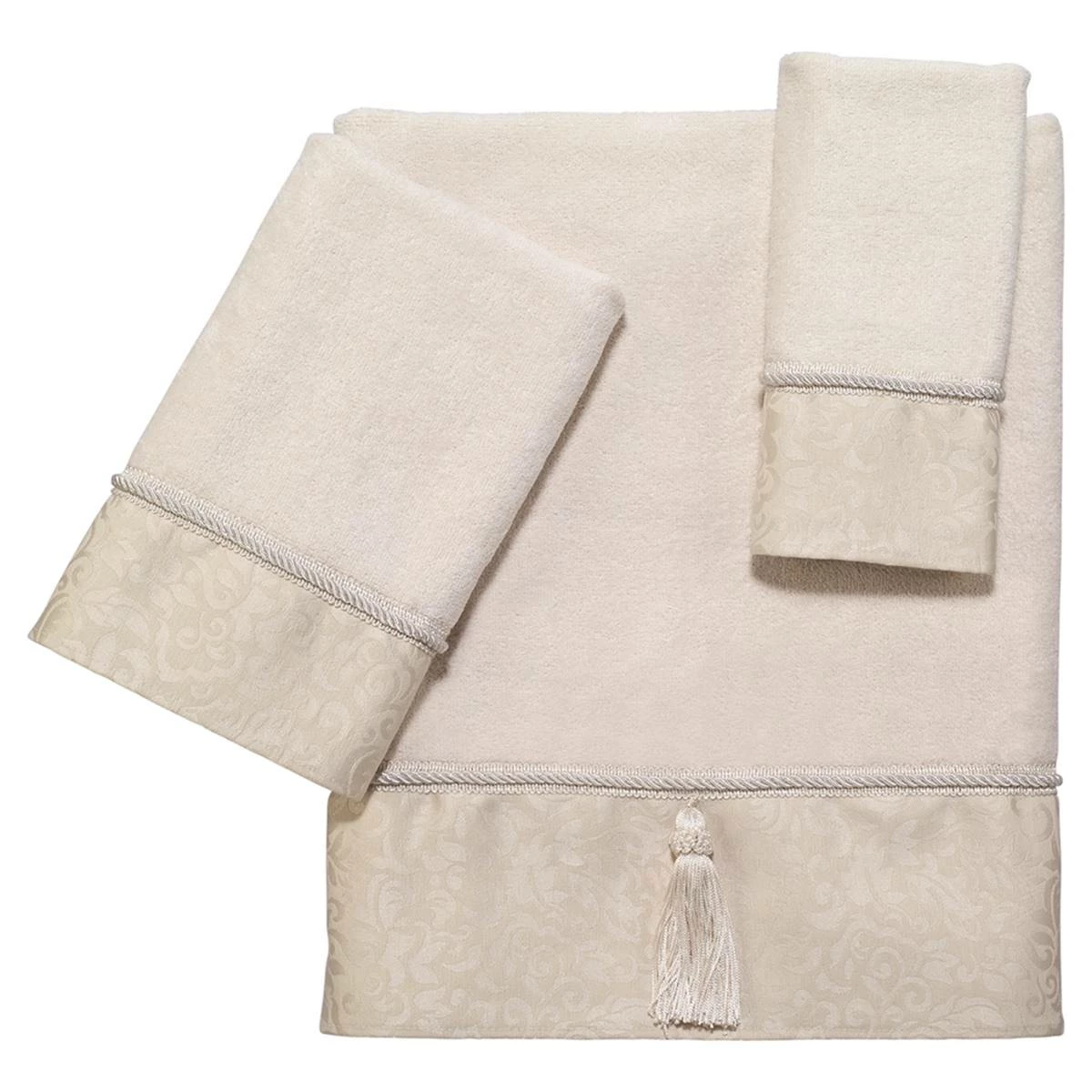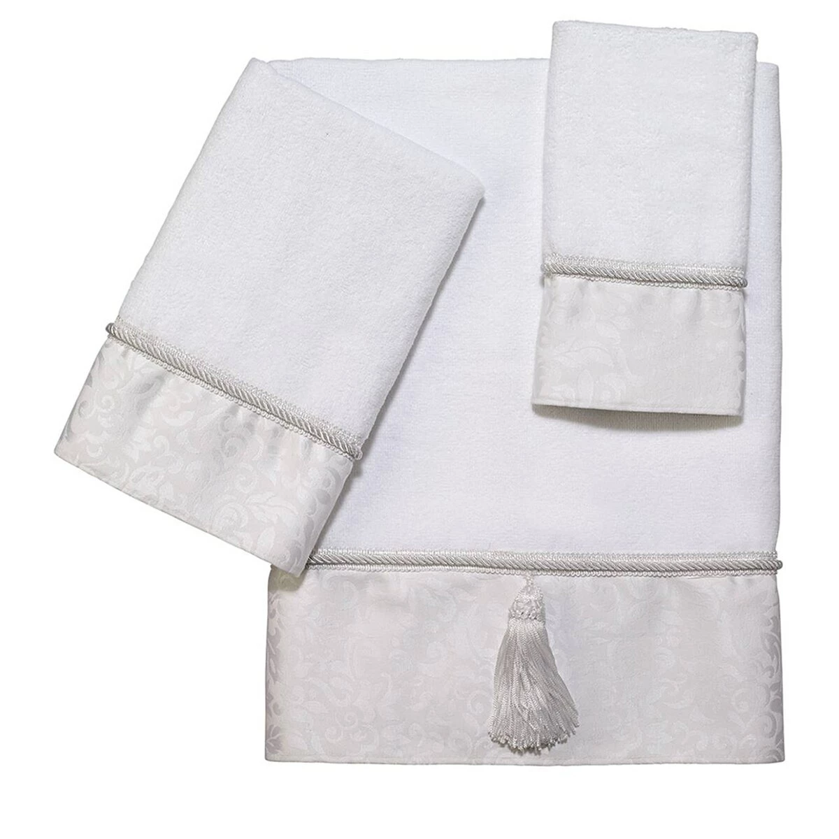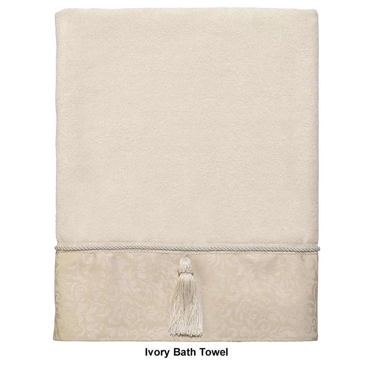 The Avanti Manor Hill towel collection is decorated with a tonal woven damask jacquard border with a coordinating rope and braid trim on an ivory velour towel. A fringed tassel completes the look.