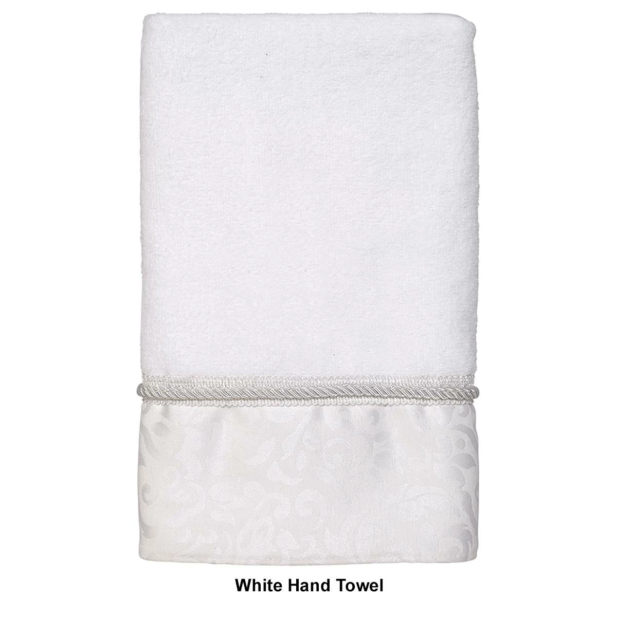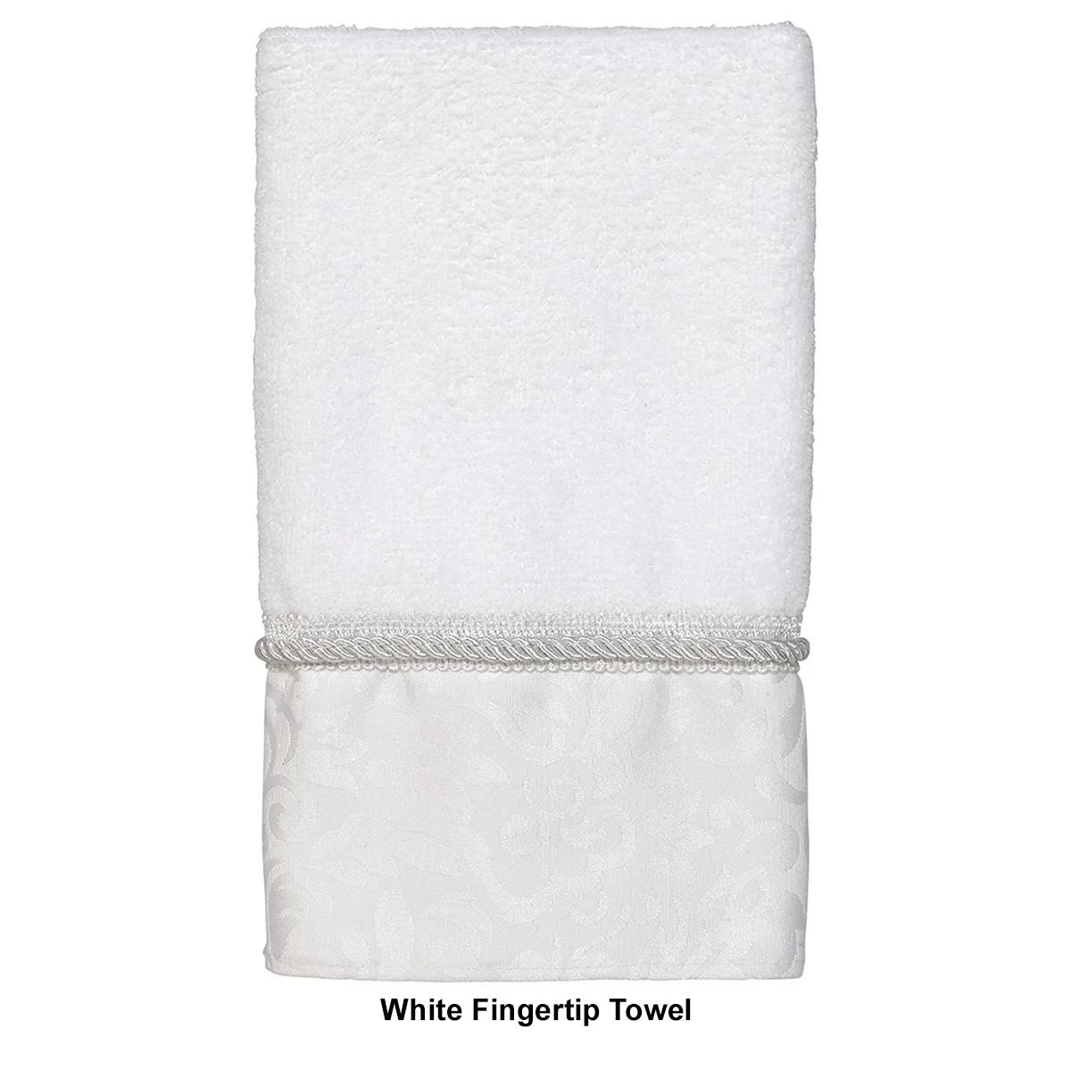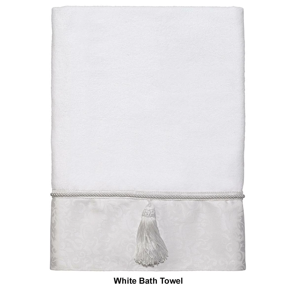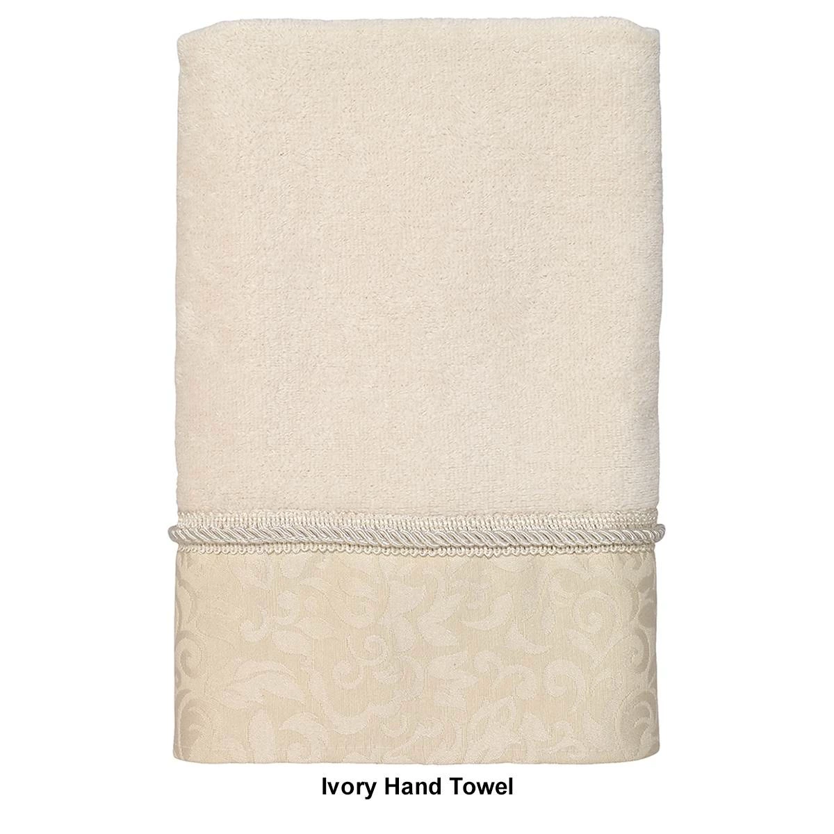The Avanti Manor Hill towel collection is decorated with a tonal woven damask jacquard border with a coordinating rope and braid trim on an ivory velour towel. A fringed tassel completes the look.