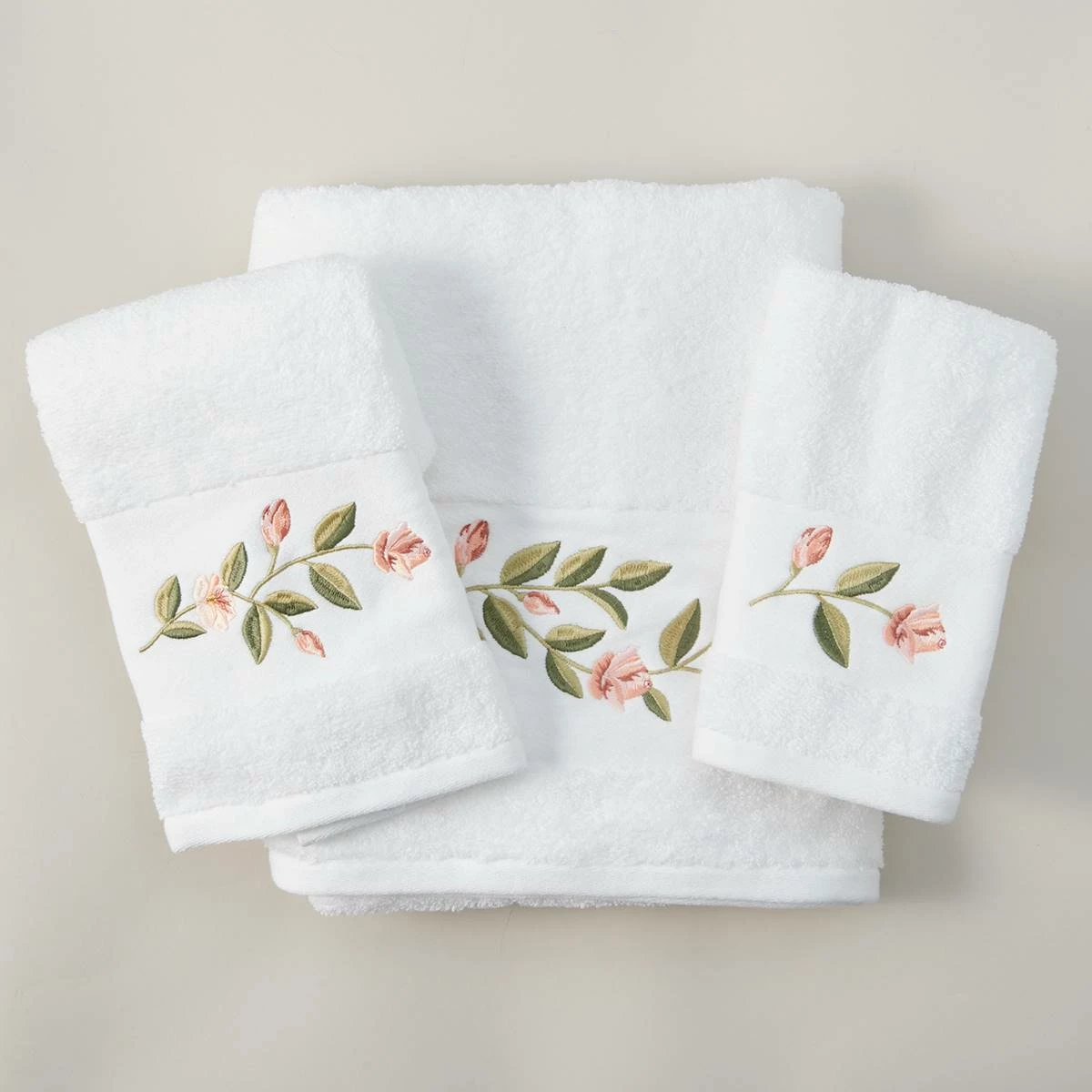 The Avanti Melrose bath towel collection is adorned by embroidered soft pink flowers and crisp white borders. A decorative addition to your bathroom.
