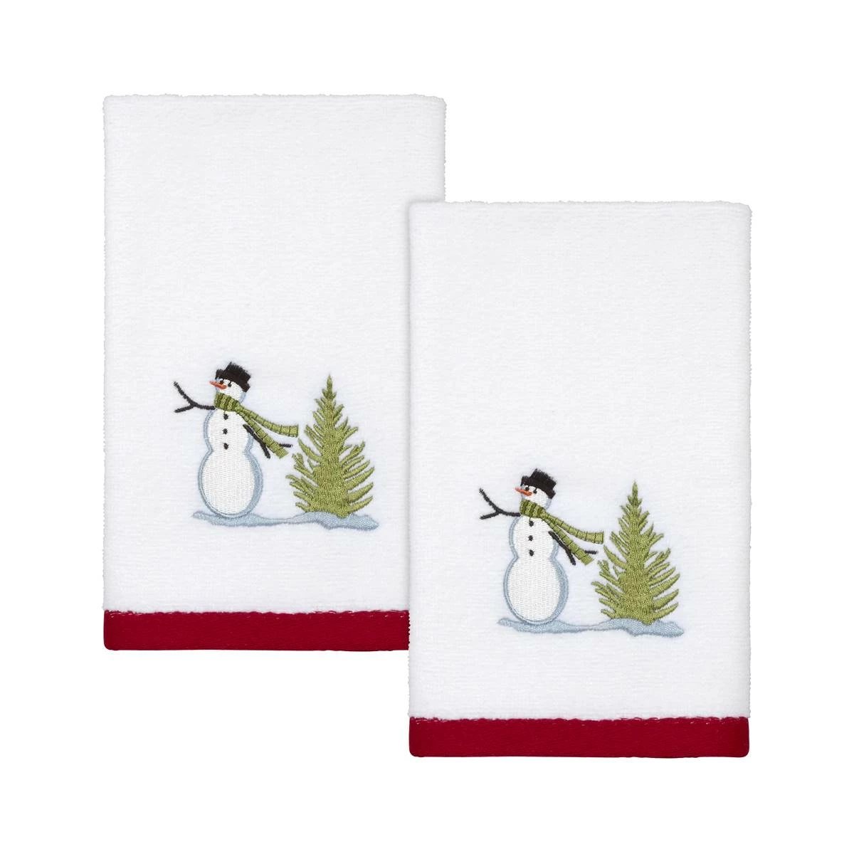 The Avanti warm welcome 2-pack of decorative fingertip towels features an embroidered winter scene with a snowman with a black top hat and green scarf standing next to a small pine tree. The two 100% cotton white velour towels are finished with a woven red polyester border.