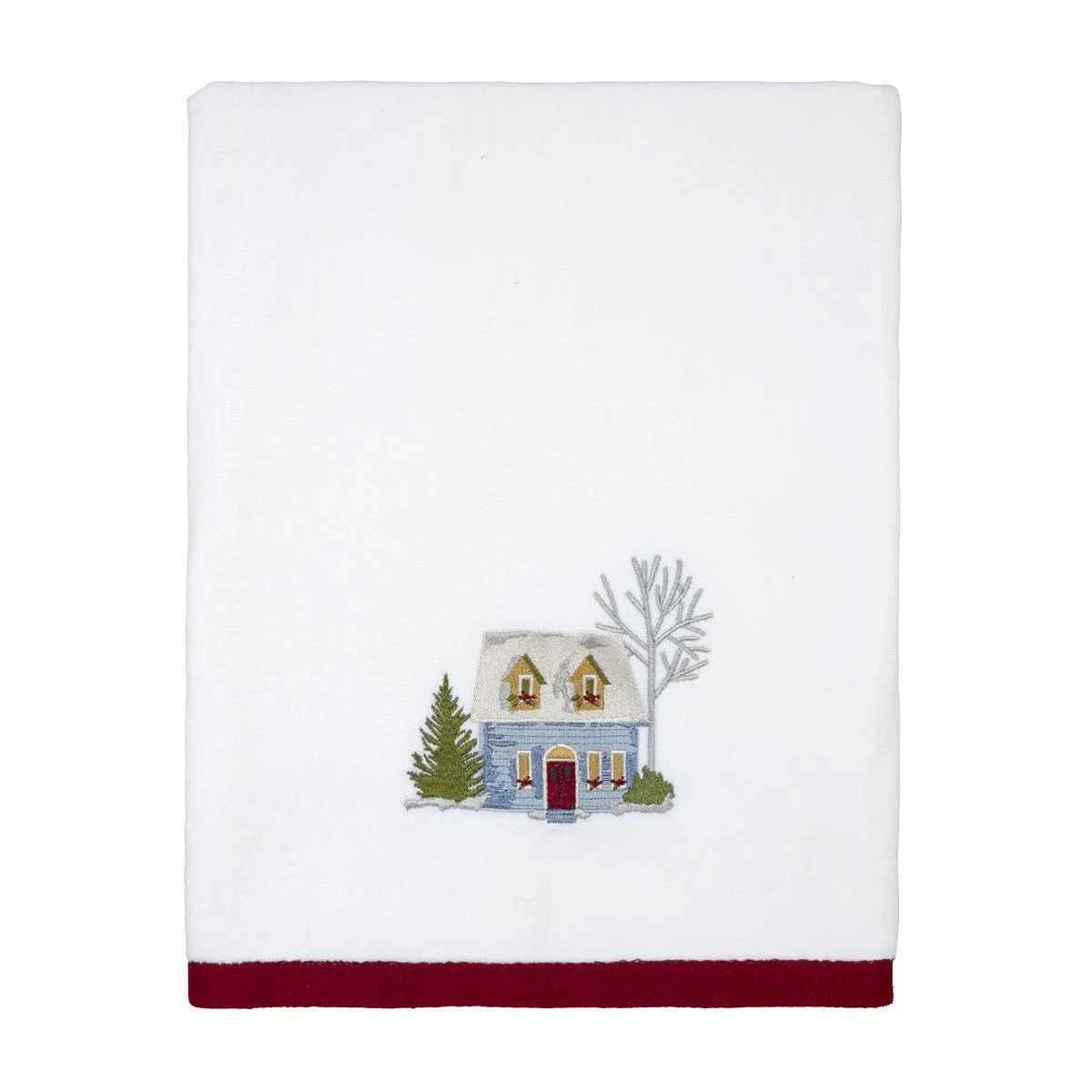 The Avanti warm welcome decorative bath towel features an embroidered light blue house decorated for the holidays with colorful accents and framed by trees on either side. The 100% cotton white velour towel is finished with a woven red polyester border.