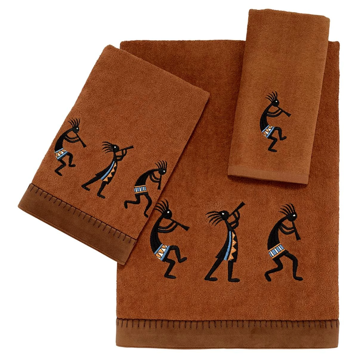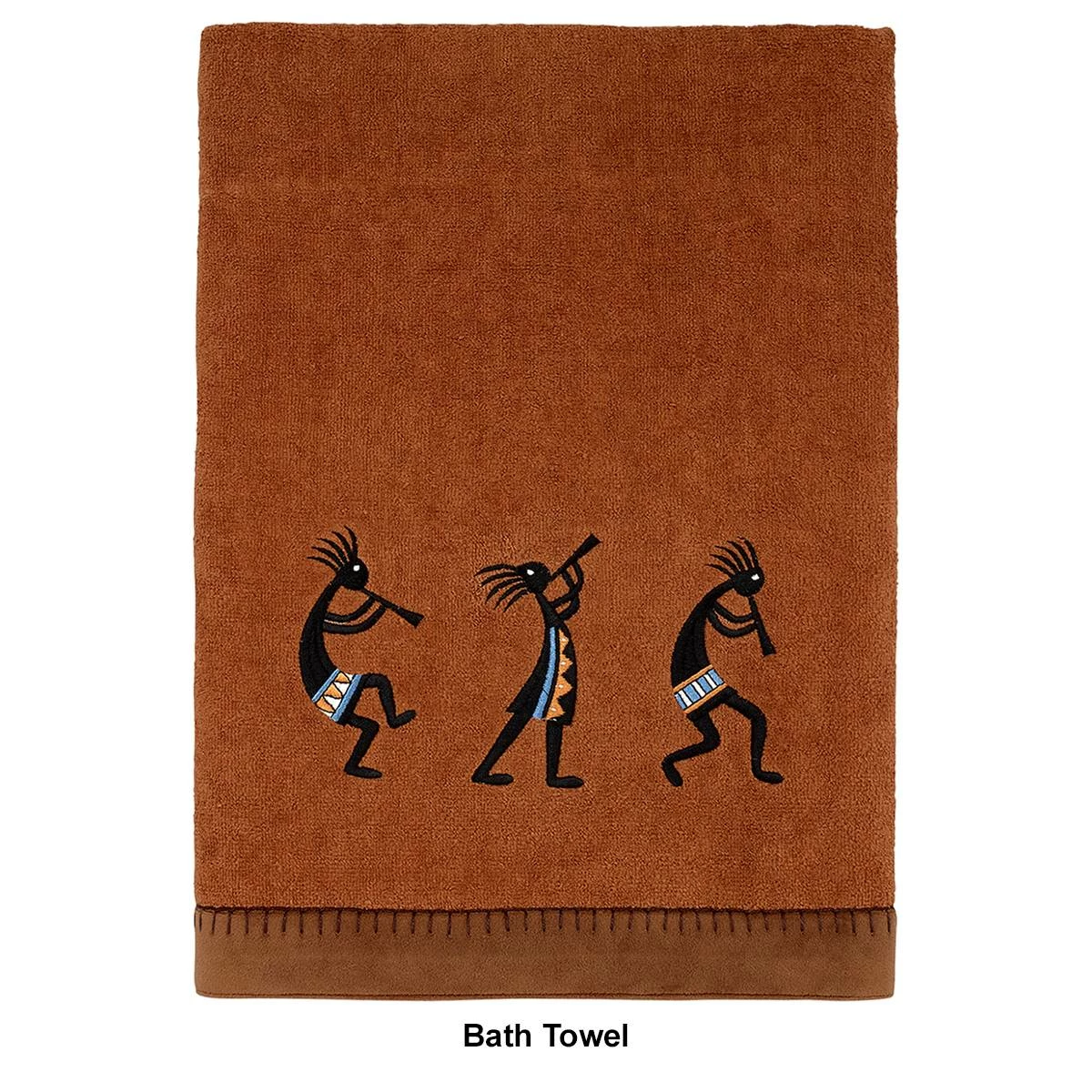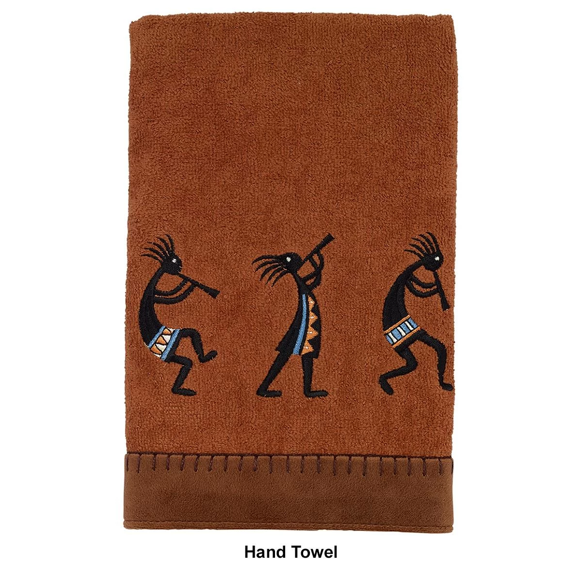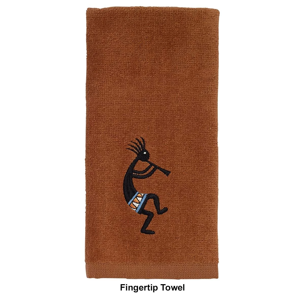 The Avanti Zuni towel collection features 3 colorful embroidered Kokopellis playing their flutes on a copper towel with coordinating suede fabric border along the bottom. The fingertip towel features a colorful Kokopelli playing its flute on a copper towel.