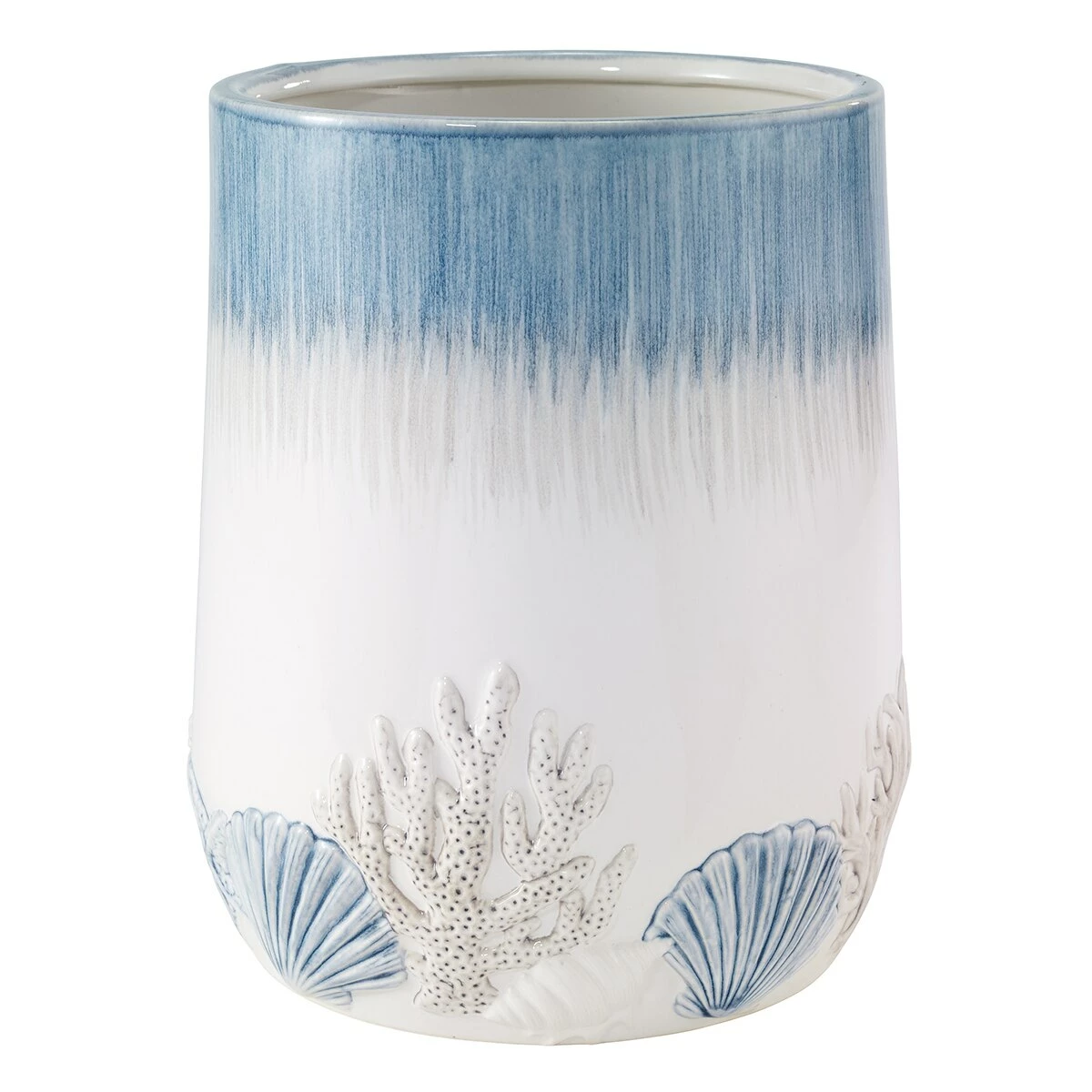 This Avanti Abstract Coastal wastebasket is decorated with blue and beige irregular brushstrokes on a white base. Beautiful coral, starfish and shells in beiges and blues wrap the bottom.