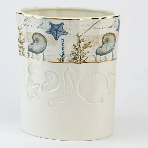 This Antigua wastebasket from the accessory collection features a shell motif decal in soft tones of natural & blues with debossed shells on an ivory base color.