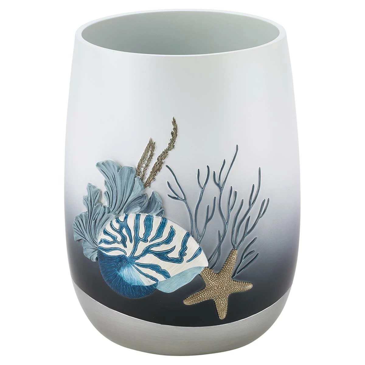 The Avanti Blue Lagoon wastebasket is decorated with raised starfish, shells, and coral in shades of blue and beige on an ombre base that goes from off-white to dark blue. A contrasting silver border adorns the bottom.