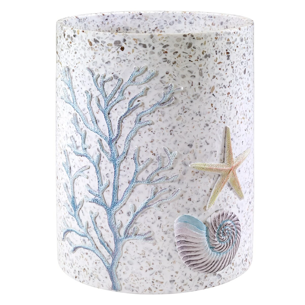 Add this Avanti Coastal Terrazzo wastebasket to your bathroom collection. It is made of resin combined with chips of multi-colored stones for the base with a nautilus, starfish, and coral added in hand-painted relief.