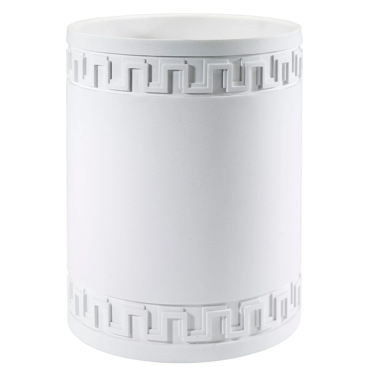 Add this Now House by Jonathan Adler Gramercy wastebasket to your bathroom collection. It features a classic Greek key embossed at the top and bottom of the white body.