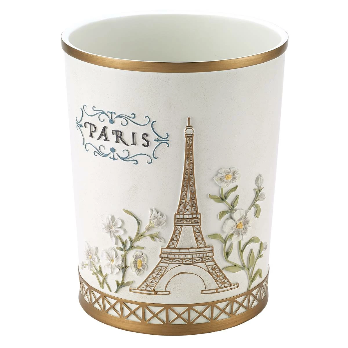 The Avanti Paris Botanique wastebasket features the word “Paris” in grey, the Eiffel Towel in gold and flowers in neutral shades on an off-white base. The bottom is bordered with a gold grid pulled from the Eiffel Tower.