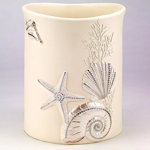The Avanti Sequin Shells Wastebasket offers a clean, updated coastal look for your bathroom. Features an off-white textured body with raised shells and starfish with silver highlights.
