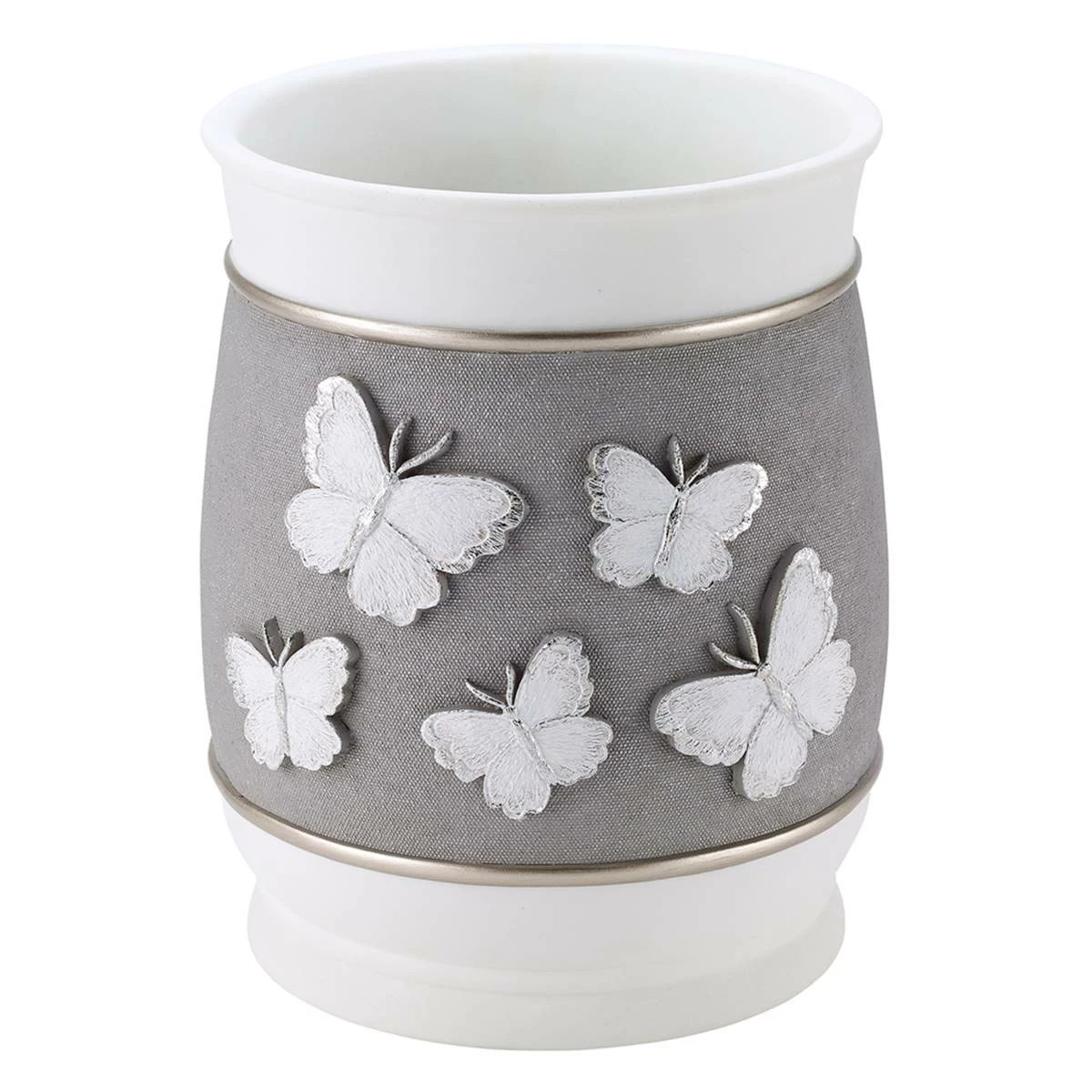 The Avanti Yara wastebasket features a grey textured center, decorated with 5 raised textural white and silver butterflies, bordered with a silver ring of matte white finish with glitter for a subtle texture on the top and bottom.