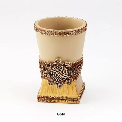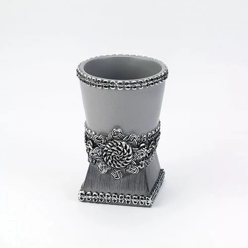 The Avanti Braided Medallion tumbler has a 2-tone body that is separated by the intricately carved braid and medallion adding an understated elegance to any bathroom or kitchen. Wipe with a damp cloth to clean. Dimension: 4.37βH x 2.91βW x 2.91βD.