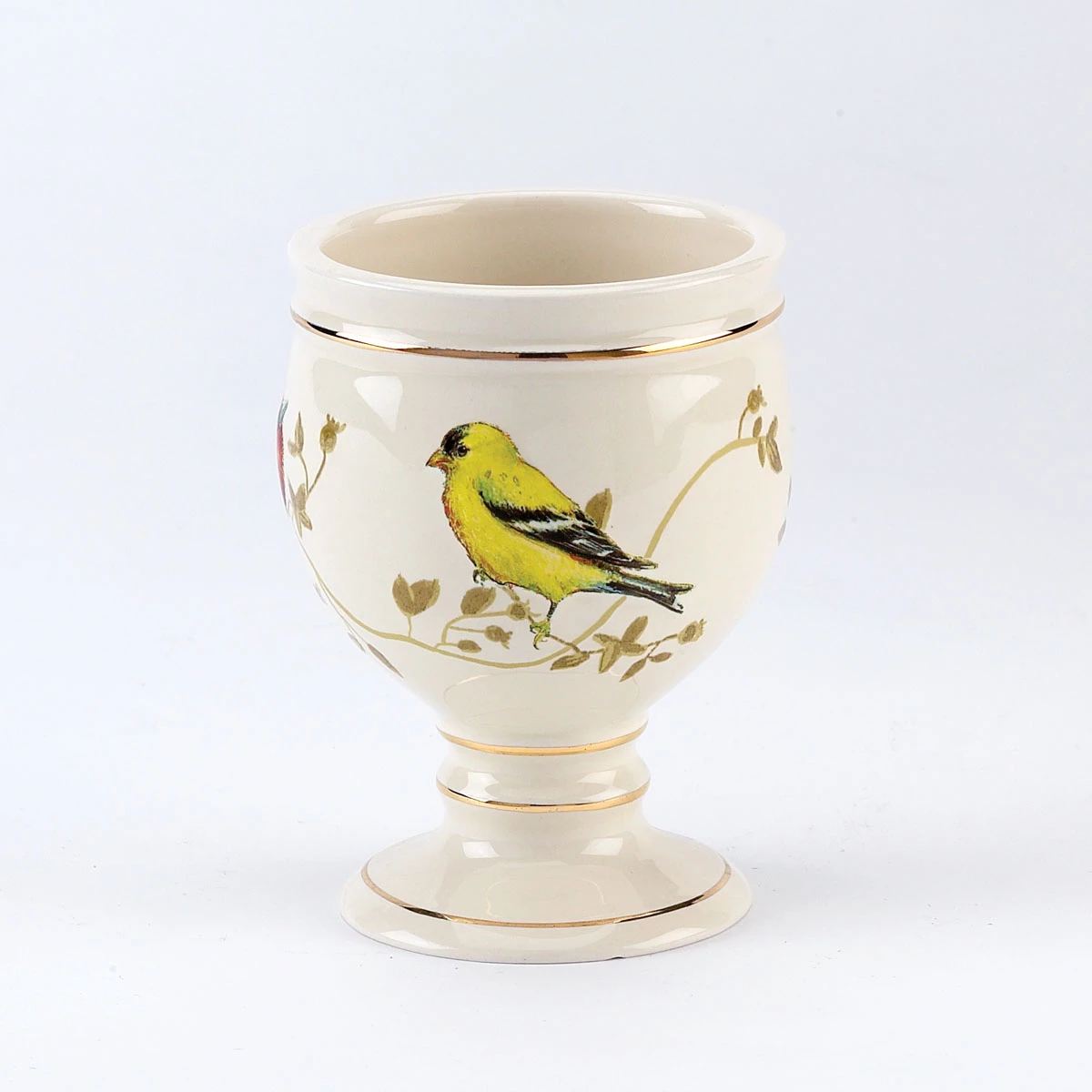 Ceramic tumbler features birds on a ivory background and gold-tone accents.