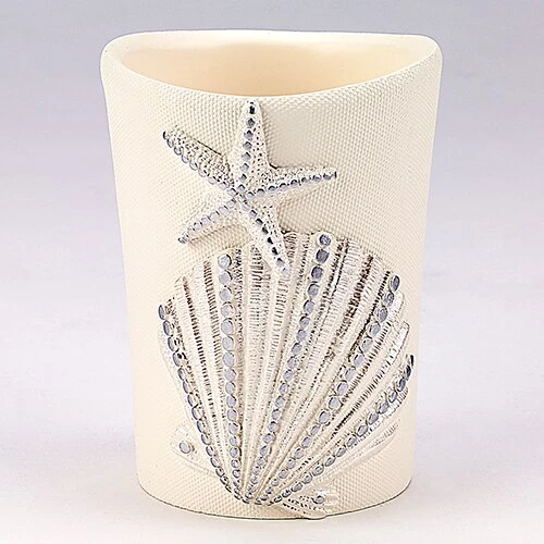 The Avanti Sequin Shells Tumbler offers a clean, updated coastal look for your bathroom. Features an off-white textured body with raised shells and starfish with silver highlights.